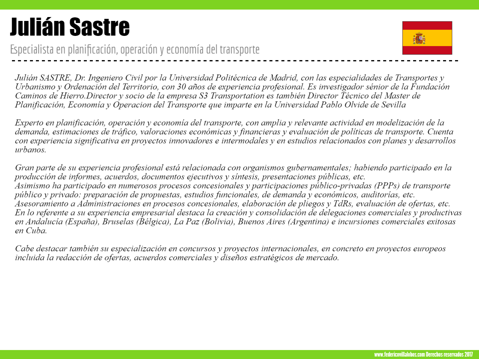 En la sección Hablan los Expertos, Federico Villalobos conversa con colegas de la industria financiera y de las infraestructuras alrededor del mundo con el objetivo de conocer de primera mano lecciones aprendidas y compartir a su vez las mejores prácticas internacionales. En esta ocasión conversamos con el reconocido experto internacional en planificación, operación y economía del transporte Julián Sastre, quien nos brinda una interesante perspectiva sobre el rol del transporte público y los mecanismos para su financiamiento y gestión.