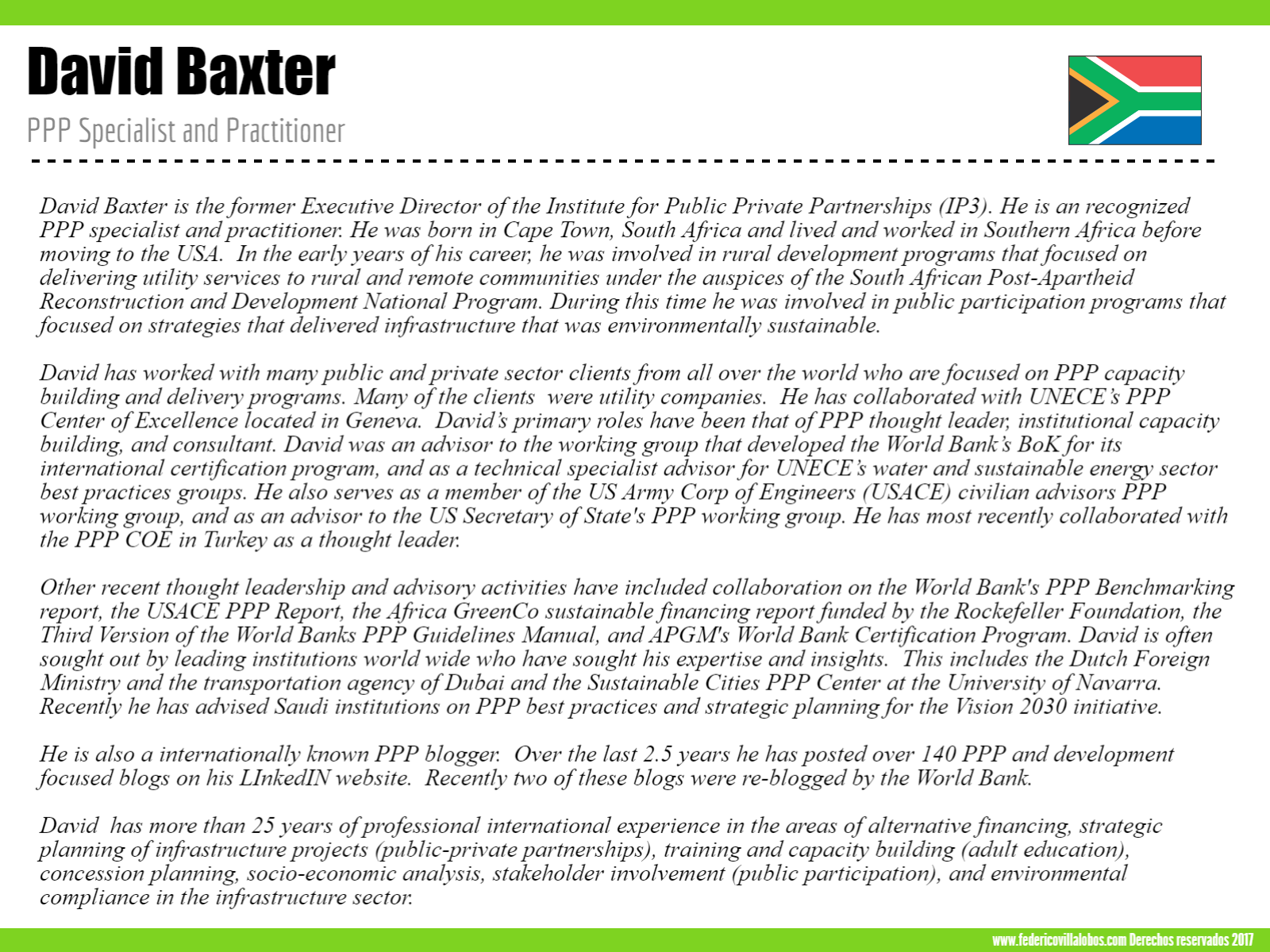 This week, we talked to David Baxter, recognized PPP specialist and practitioner and former former Executive Director of the Institute for Public Private Partnerships (IP3). As an industry expert, David analizes PPP schemes as a mechanism to close the infrastructure gap in emerging countries and key steps to successful project structuring.